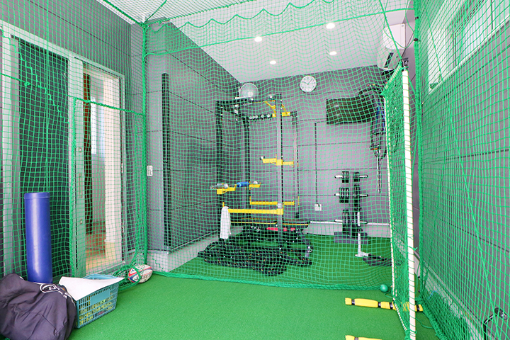 1Fのトレーニングルームです。お家づくりのスタートが「トレーニングルームを作りたい!」というところからです。打合せの時に、息子とトスバッティングとウエイトトレーニングができるスペースが欲しいと伝えました。國近さんに一番最初に描いていただいた図面では、玄関との兼ね合いでトレーニングルームが今よりかなり狭かったんです。玄関の幅を少し狭くしてスペースを広く確保する等、話し合いをしながら打合せを進めていきました。バッドを思い切り振ったらどれくらいスペースがいるかなって國近さんと考えながら(笑)。息子も以前は、学校の施設を利用してトレーニングしていたのですが、今は家でそのままトレーニング出来るのが良いですね。
