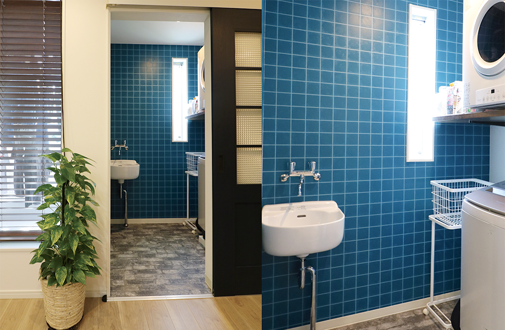 お気に入りのランドリールーム。ブルーのクロスが爽やか。