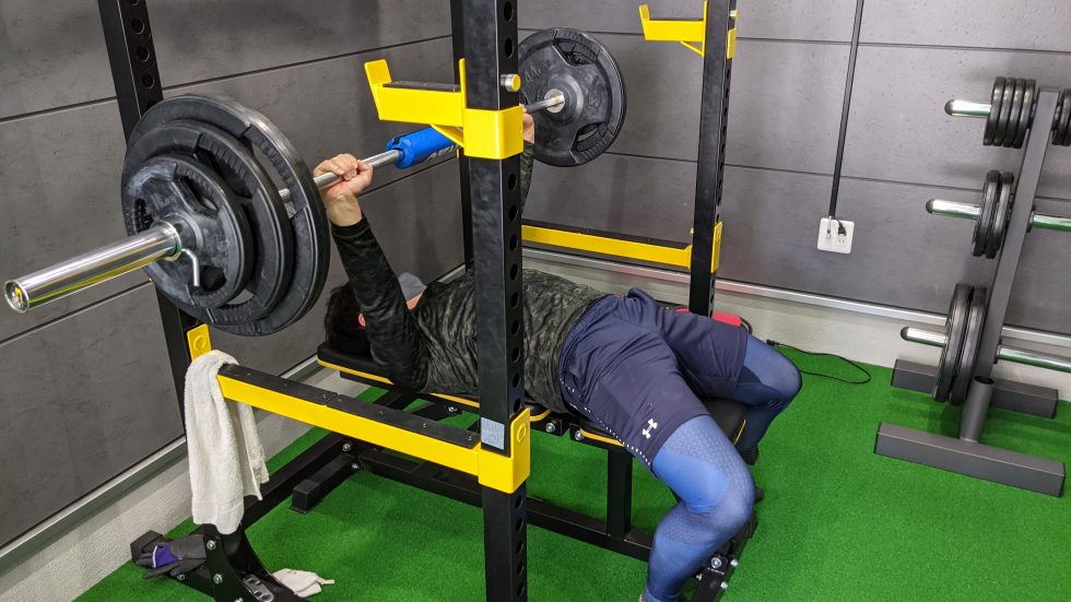 重たいバーベルを持ち上げる息子さん。毎日のトレーニングの成果です!
