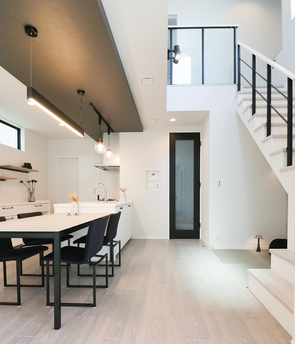 ダイニングキッチン横に吹き抜け階段を設け、空間に開放感を取り入れました。