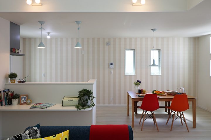 ストライプのアクセントクロスがかわいいLDK。キッチン前のカウンターは、ちょっとした食事やスタディカウンターとしても◎