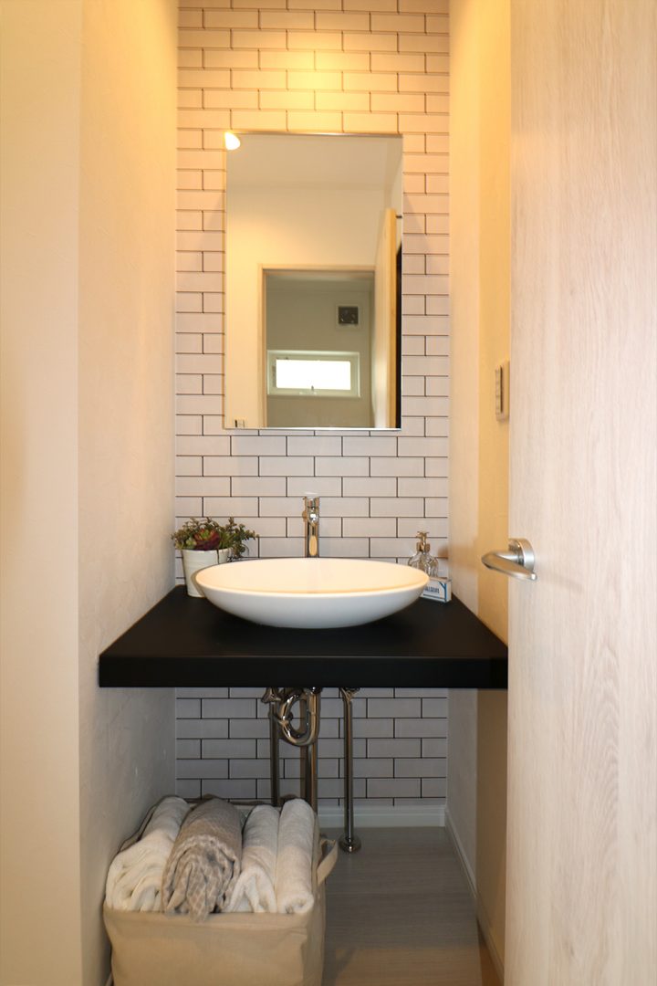 サブウェイタイル調のアクセントクロスが目を引くトイレ前の洗面スペース。丸い洗面ボウルを中心に可愛らしく演出された空間です。