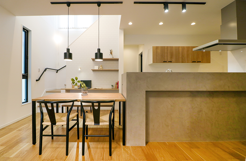 腰壁とカウンター部分をモールテックスで仕上げました。無機質なモールテックスと突板床材の異素材MIXがお家の顔に。