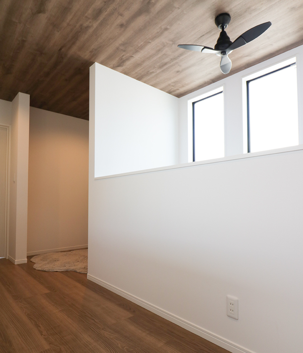 内装に合わせた濃い木目天井の吹抜けに、ブラックのシーリングファンを組み合わせました。
