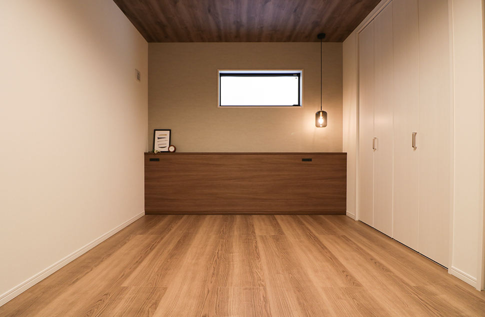 ヘッドボードを造作した主寝室。腰壁と天井のクロス・巾木・腰壁笠木をダークの木目に揃えました。グレー×ゴールドのペンダントを吊るし、よりホテルライクな空間に。