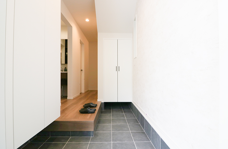 L型土間にすることで奥行きを出し、空間を広く印象付ける工夫をしました。またミラー付きのトール収納に加え、階段下を活用した収納も設けているので、ベビーカーなど大きい物もしまえます。