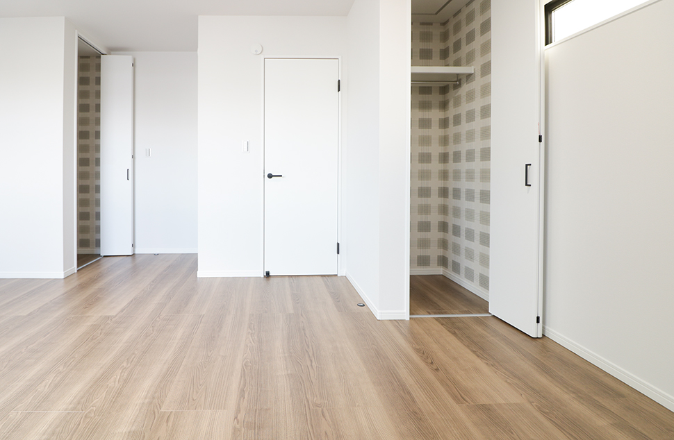 将来間仕切り設置も可能な、約9.6帖の洋室。それぞれクローゼット内にはグリーンのチェック柄がかわいいクロスをあしらいました。