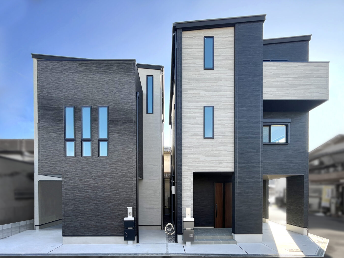 3つ連なった縦滑り窓がシンボリックな、グレーをアクセントにしたカジュアルな外観。※左側