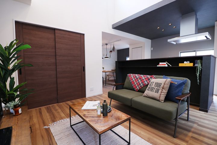 存在感のあるアイランドキッチンは、手元が見えない様に壁を高くしています。カウンター下に棚があり、お気に入りのインテリアを飾って。