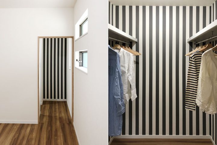 主寝室のW.I.Cはグレーとホワイトの大きめのストライプを使用しました。居室からチラッとみえるクロスがとてもかわいいです。