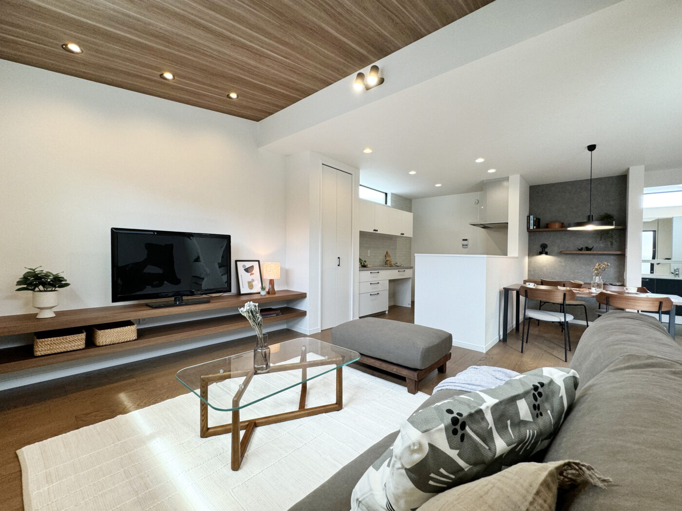 勾配天井を採用し、より開放的に感じられるリビング。TVボードを壁に造り付けることで、スタイリッシュで「魅せる収納」としても。