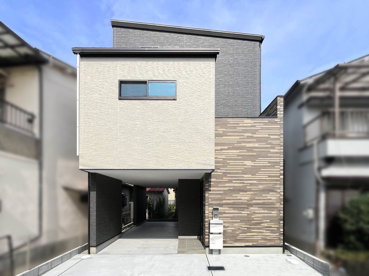 ホワイトとグレーを組み合わせて、凹凸を強調したモダンでシックな外観。アクセントに木目柄で素材感を際立たせました。