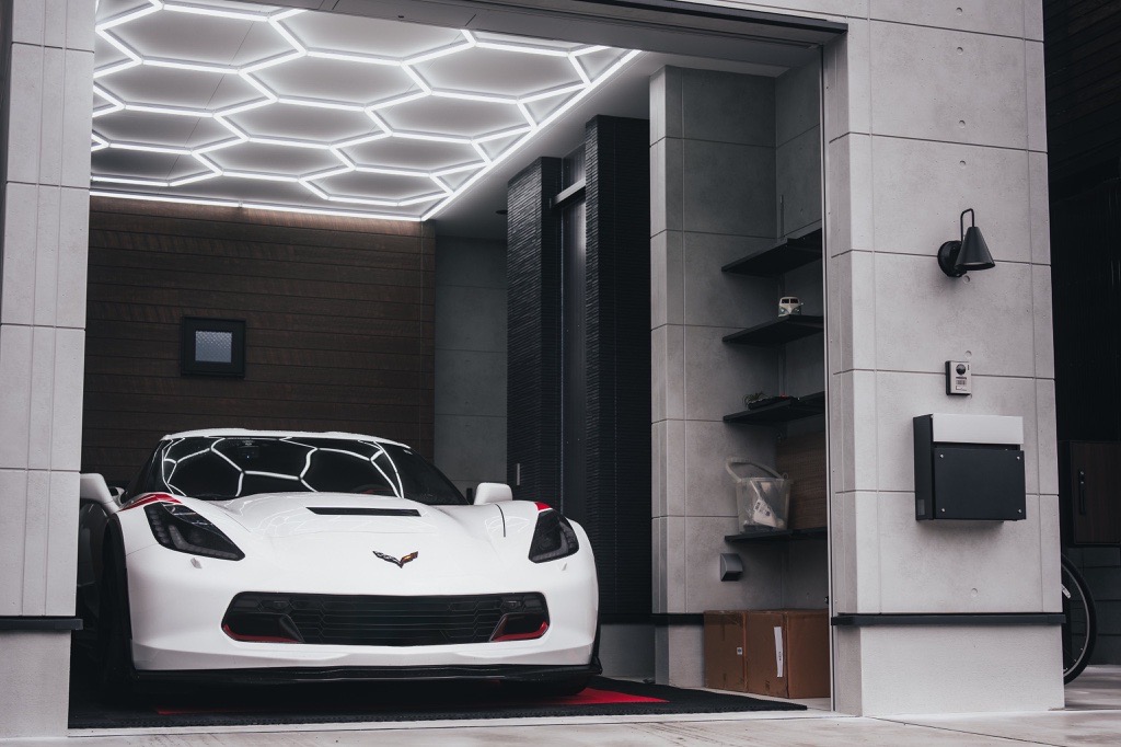 愛車のメンテナンスやカスタマイズを存分に楽しめるよう、手洗い台や収納棚、有孔ボードを設置しています。