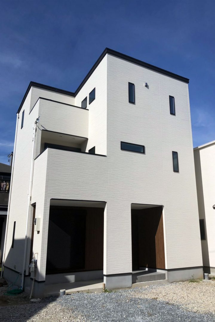 木目と黒い窓枠がアクセントになるよう、ホワイトをベースカラーにした外観。