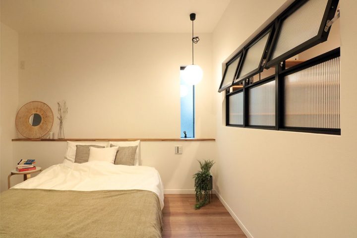 造り付けのベットボードにお気に入りのアートや植栽を飾って。