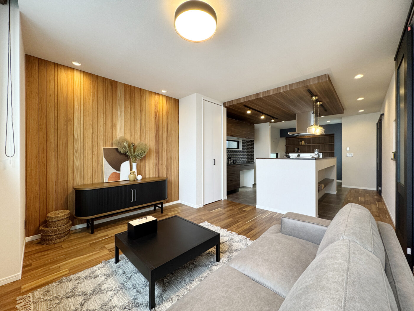 LDKを中心に木材やモルタル調の仕上げ材をたっぷりとあしらい、温かみのあるカフェのような空間に仕上げました。床材には突板を使用し、質感はもちろん経年変化も楽しんでいただくことができます。ダイニング横のヌックには本棚がありますので、足を伸ばして本を読みながらくつろいだり、ラグやクッションをおいてお昼寝したり…。食事や作業をする際には、ダイニングチェアの代わりに使用していただくなど、用途によって使い分けることができます。また、ブラケットライトやペンダントライトなどを要所に取り入れることによってポイントを作るなど、照明器具にもこだわりました。