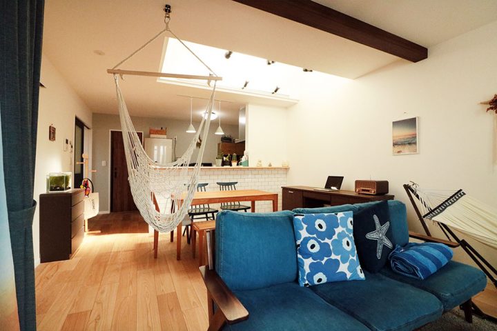吹き抜けの窓からおだやかな光が降り注ぐ明るいダイニング。ハンモックに揺られながら、吹抜けからのあたたかい日差しを浴びることができます。