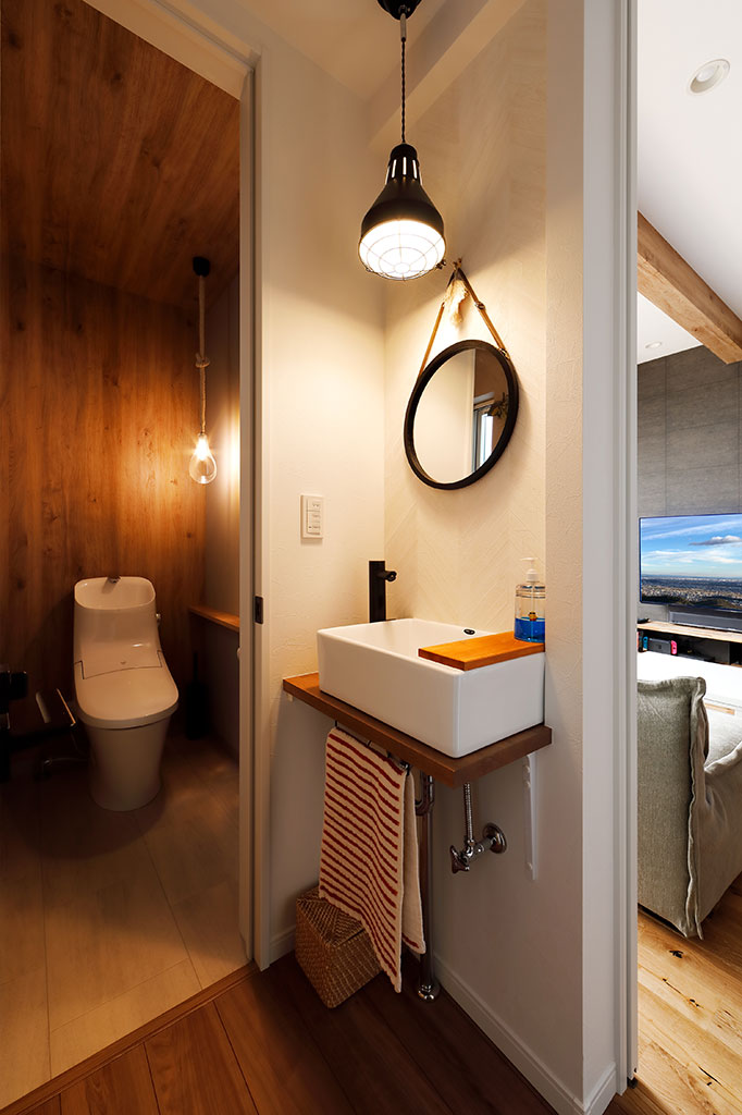 2階のトイレ横に設けた、造作手洗いカウンター。トイレには木目調のアクセントクロスとペンダント照明で落ち着いた空間に。