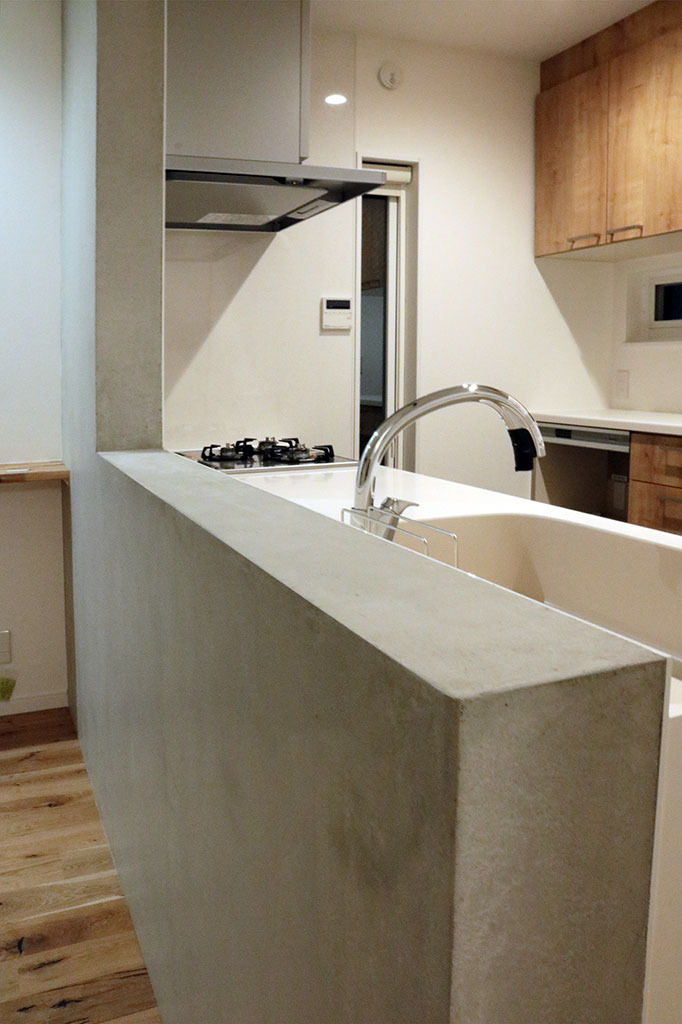 マットな質感がかっこいい、モルタルを使用したキッチン。