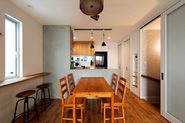 モルタル×オークのテーブルが美しいダイニングスペース。