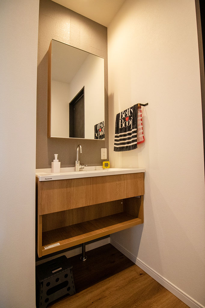 2階ホールのトイレ横に設置したフロートタイプの独立洗面台。