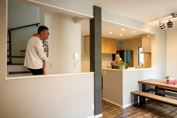 毎朝自然とキッチンにいる奥様と顔を合わせられるリビング階段。チャコールの柱が目を引く空間になりました。