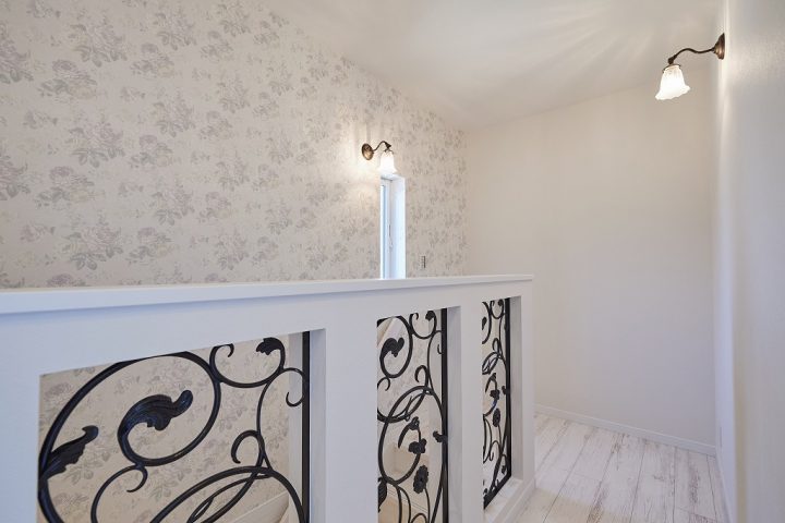 ミルクグラスの照明、輸入壁紙、アイアンの飾りでシャビーシックな空間に。