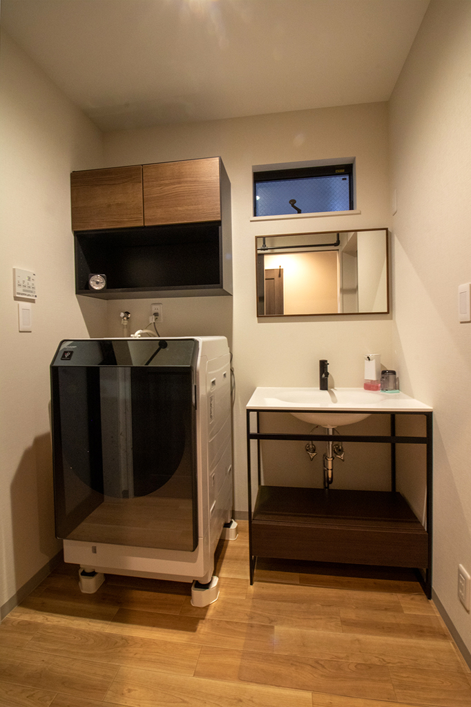 洗濯機上のたっぷり入る扉付収納やアイアンの洗面台など、お施主様のご要望が詰まっている。
